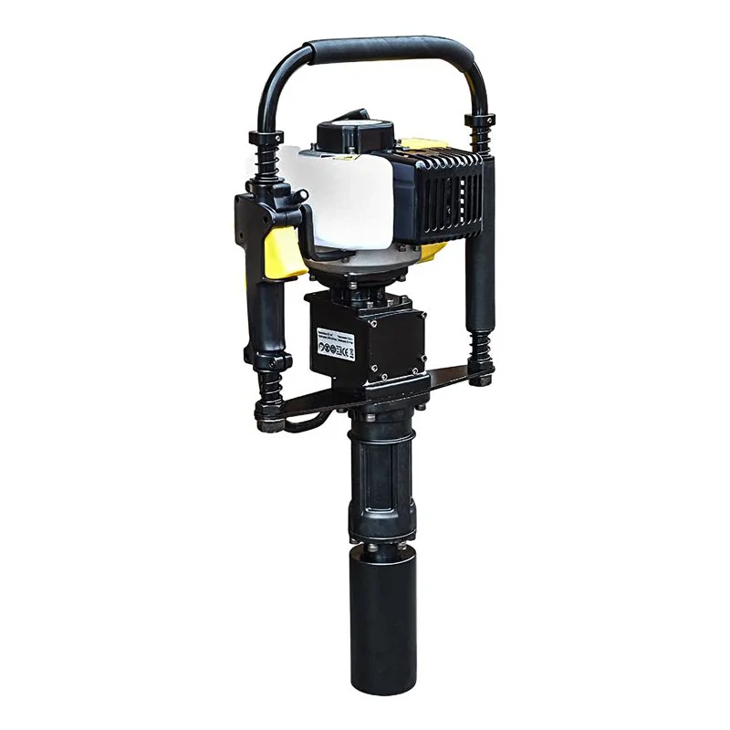 Бензиновый копер TSS-55GPD с силой удара 25–45 Дж используется для забивания свай диаметром до 69 мм на строительных площадках или в индивидуальных хозяйствах. Инструмент работает на двухтактном двигателе мощностью 1,22 л.с., оснащенном ручным стартером. Экономичное потребление бензиновой смеси обеспечивает продолжительную работу на одной заправке топливного бака.
