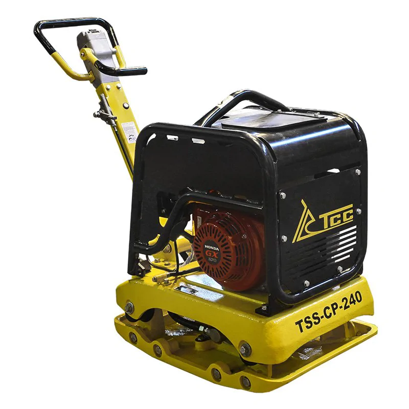 Виброплита TSS-CP-240 применяется для уплотнения грунта, щебня, гравия и других сыпучих материалов при проведении дорожно-строительных и ремонтных работ в ограниченных пространствах. Центробежная сила 35000 Н позволяет уплотнять грунт на глубину до 700 мм. Реверсивный режим удобен для трамбовки грунта в прямых траншеях. Устройство работает на бензиновом четырехтактном двигателе Honda GX270 мощностью 9 л.с. с ручным стартером. Производительность машины составляет 480–650 м²/ч.