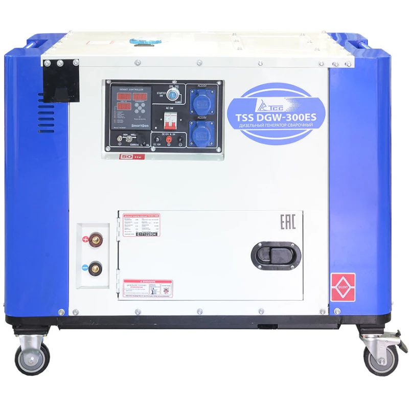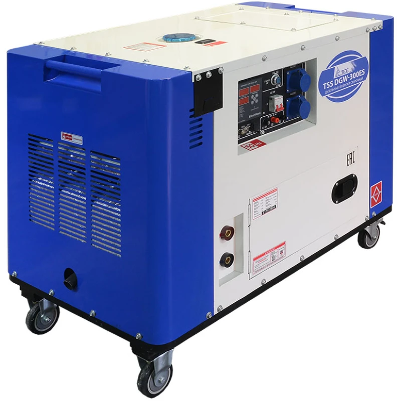 Сварочный генератор дизельный для ручной электродуговой сварки MMA постоянным током, напряжение 230 В, мощность 4 кВт, сварочный ток 120-300 А, диаметр электрода 1-6 мм, 4-тактный двухцилиндровый дизельный двигатель TSS SV292F объемом 997 куб.см и мощностью 19 л.с., топливный бак 25 л, расход топлива 3,5 л/ч, электростартер, 2 розетки 230В/16А, выход 12 В, цифровой дисплей SmartGen HGM501, счетчик моточасов, дистанционная регулировка тока, AVR, блок зарядки АКБ, уровень шума 72 дБ, габариты 1180х720х1020 мм, вес 263 кг, аккумулятор, транспортировочные колеса, сварочный инверторный аппарат САИ-140, шумозащитный кожух.