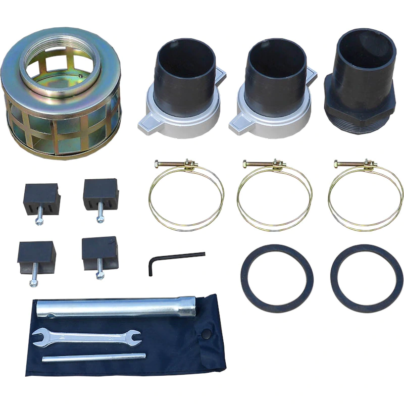 Вместе с мотопомпой ТСС PGT80 поставляются необходимые комплектующие: входной и выходной патрубок, прокладки, накидные гайки, хомуты и фильтр.