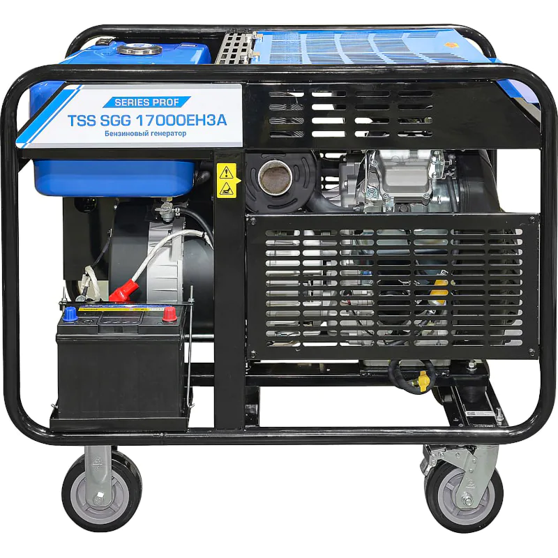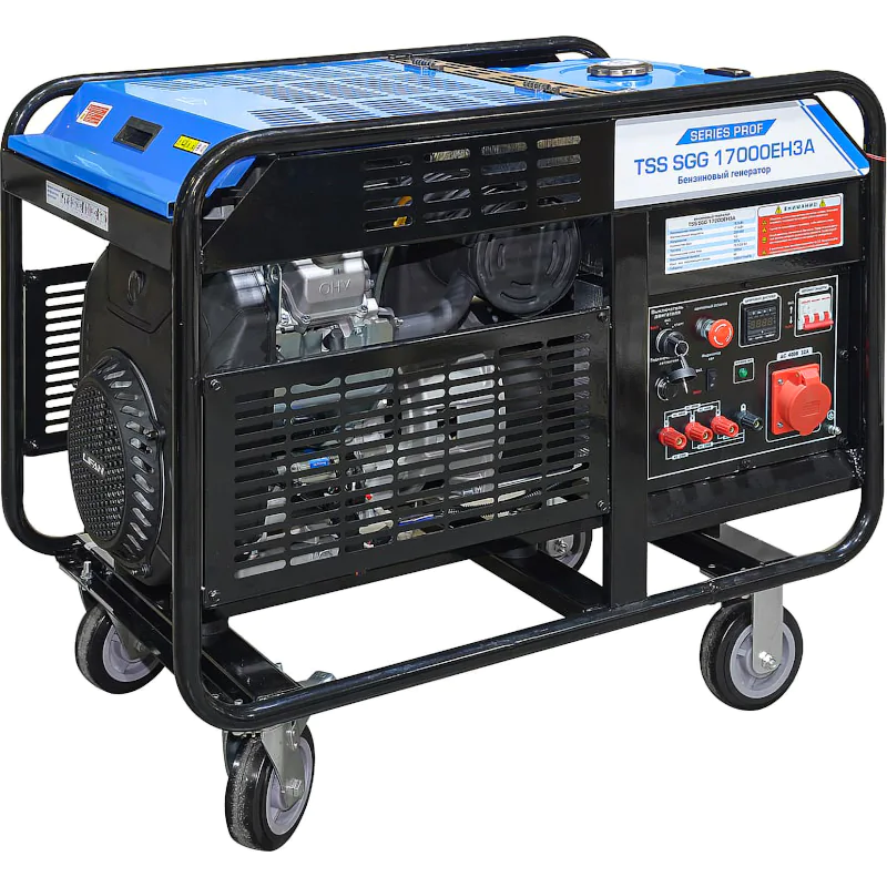 Генератор ТСС SGG 17000EH3A оборудован колесами для удобства перемещения. Прочная стальная рама защищает двигатель от механических внешних воздействий. Электрическая розетка снабжена крышкой, предохраняющей от влаги и пыли. Специально предусмотренные выходы на лицевой панели позволяют подключить блок ввода резерва для автоматического включения генератора при отсутствии напряжения в сети.
