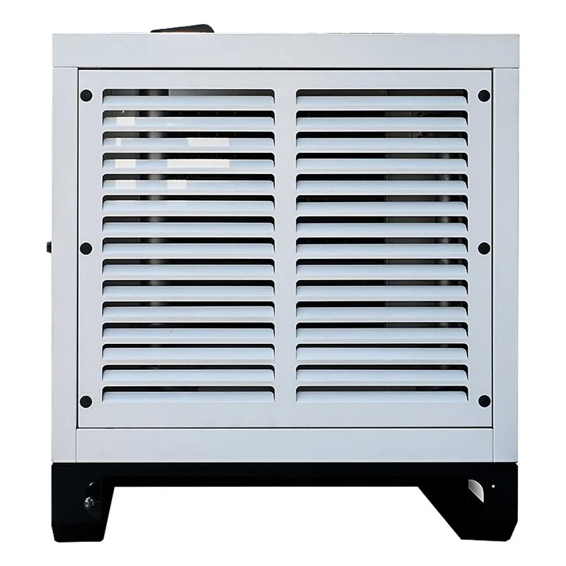 Дизель-генератор предназначен для стационарной установки в помещении или на улице. Закрытый кожух обеспечивает эффективную защиту от шума работающего двигателя и внешних неблагоприятных воздействий. Дверцы имеют отверстия для доступа к панели управления, аварийной кнопке и электростартеру для удобства обслуживания и управления. Многочисленные вентиляционные решетки обеспечивают эффективное охлаждение генераторной установки.