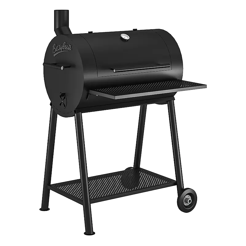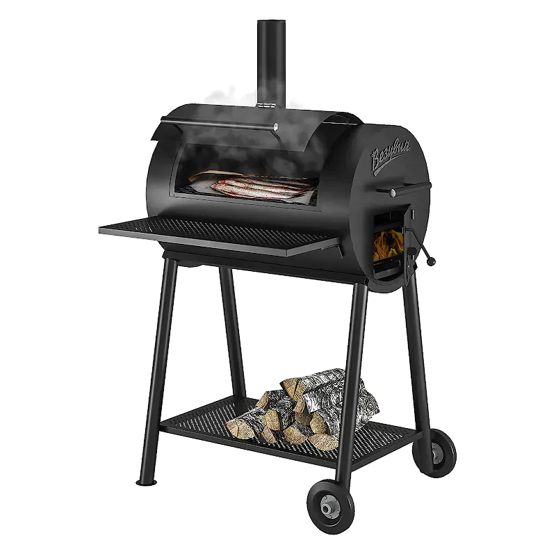 Для удобного использования на передней поверхности смокера сделана съёмная стальная полка для размещения продуктов и посуды. Смокер установлен на подставке с надёжными стальными ножками. В нижней части подставки сделана полка, на которой удобно хранить дрова и инструменты для работы со смокером. Две ножки смокера оснащены колёсами для удобства перемещения изделия по зоне барбекю. Для перекатывания смокера используется ручка на боковой стороне основного модуля смокера.