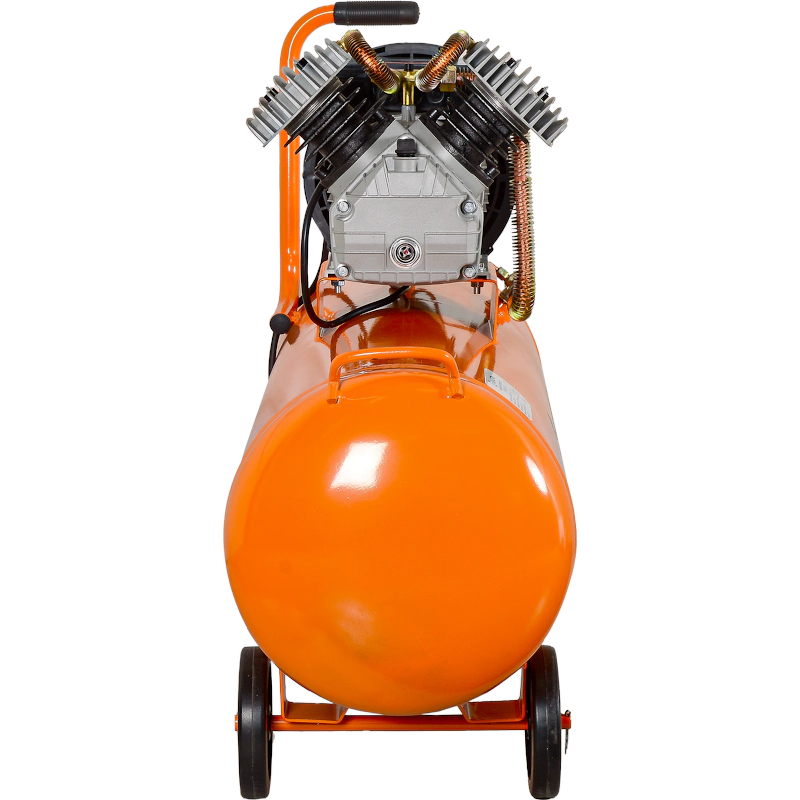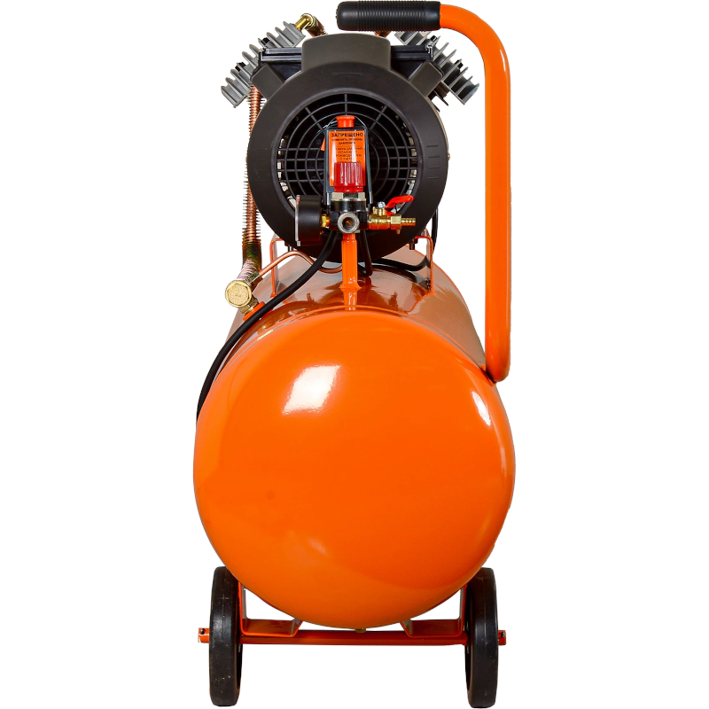 Быстросъемный штуцер и патрубок «елочка» с вентилем позволяют подсоединять к компрессору различный пневмоинструмент. Ресивер оснащен дренажным клапаном для слива конденсата. Две ручки и комплект колес упрощают перемещение компрессора. Резиновые накладки на опорных ножках выполняют роль амортизаторов.
