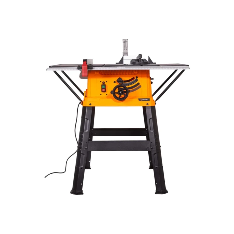 Рабочая плоскость стола 935×630 мм обеспечивает надежную опору для крупногабаритных листов фанеры или длинных досок. Параллельный упор перемещается по направляющим и фиксируется винтами – он гарантирует прямолинейность реза на всем протяжении заготовки. Угловой упор оснащен шкалой и позволяет точно выдерживать заданный угол без предварительной разметки.
