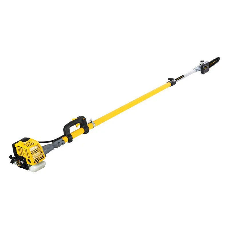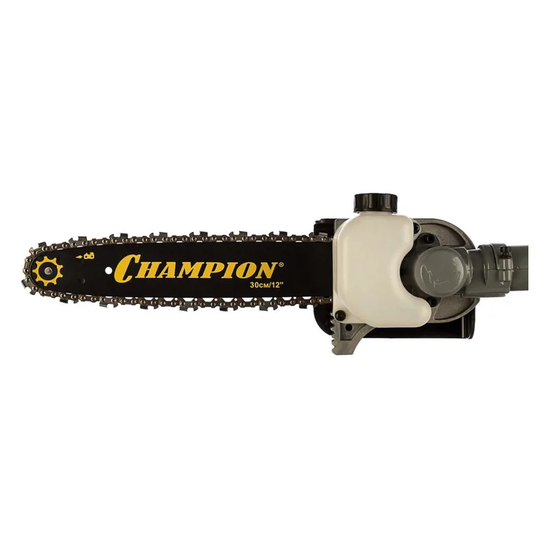 Бензиновый высоторез Champion PP126 – модель бытового назначения с двигателем мощностью 0,75 кВт и шиной длиной 30 см, которая позволяет спиливать даже толстые сучья. Длина инструмента достигает 4,25 м при разложенной штанги, что позволяет подрезать высокие ветки кустарников или декоративных деревьев.