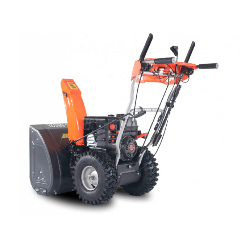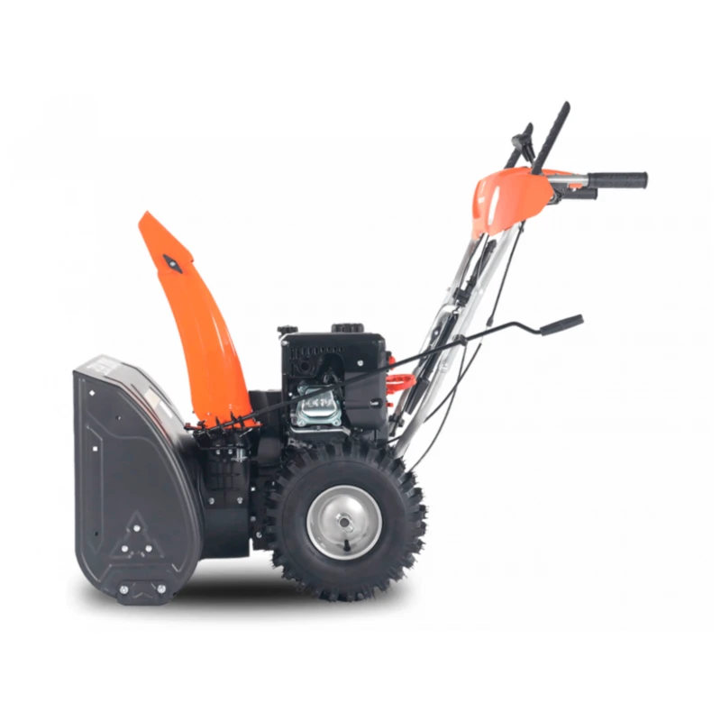 Двухступенчатый стальной шнек и металлический желоб выброса гарантируют долговечность конструкции. Самоходная колёсная база с фрикционной трансмиссией и восьмью скоростями (6 вперёд / 2 назад) обеспечивает отличную манёвренность и удобство управления.