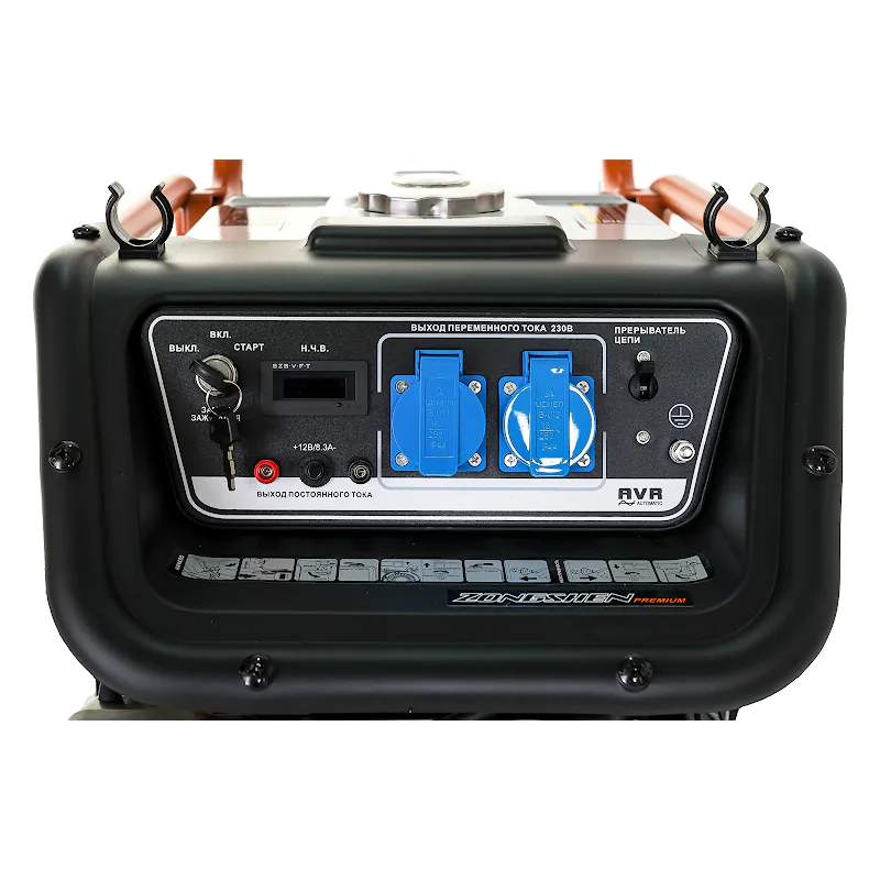 Компактный и мобильный генератор Zongshen KB 3300 E оборудован колесами и складной ручкой для удобства транспортировки и хранения. Автоматический регулятор напряжения контролирует и корректирует выходные параметры в сторону повышения или понижения. Прерыватель цепи на лицевой панели позволяет быстро отключить ток в экстренном случае. Электрические розетки снабжены защитными крышками от влаги и пыли. Металлический бензобак оснащен указателем уровня топлива, благодаря которому можно вовремя провести дозаправку.
