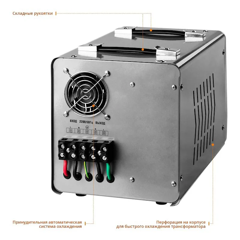 Стабилизатор напряжения переносится при помощи двух складных транспортировочных рукояток.