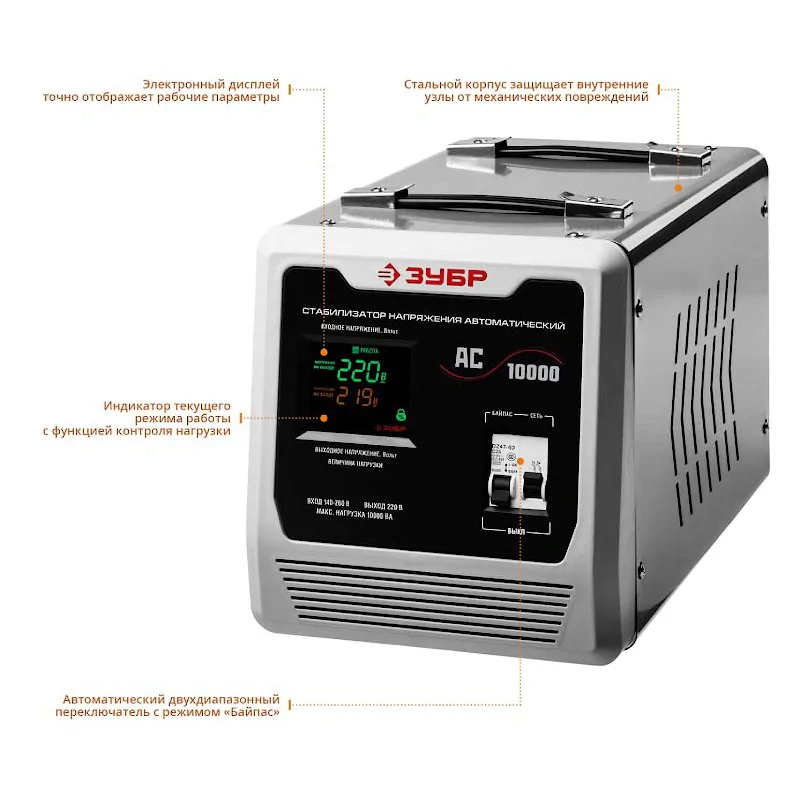 Автоматический стабилизатор напряжения Зубр АСН-10000-1-Ц мощностью 10 кВА защищает подключенную технику от перепадов электричества. Для простого использования на панели управления есть цифровой дисплей и светодиодная индикация.