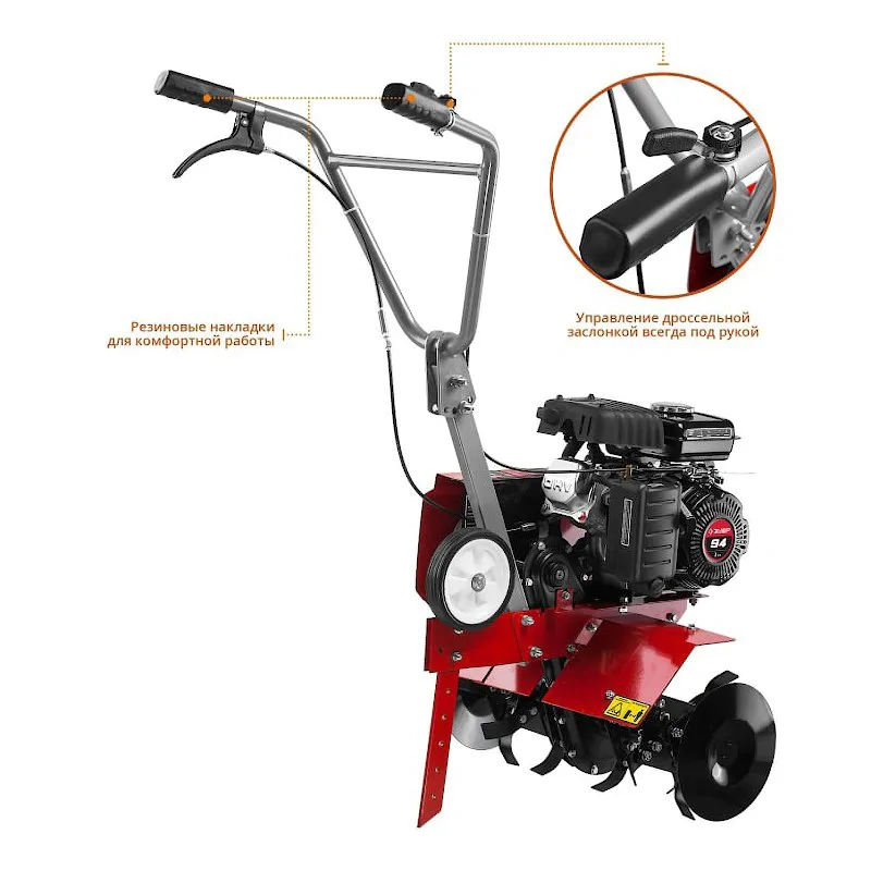 На рукоятку вынесены все элементы управления для быстрого доступа. Благодаря этому вы можете настраивать обороты двигателя при выполнении вспашки земли.