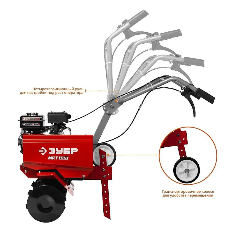 При этом руль регулируется по высоте, что обеспечивает более комфортное управление бензиновым культиватором.