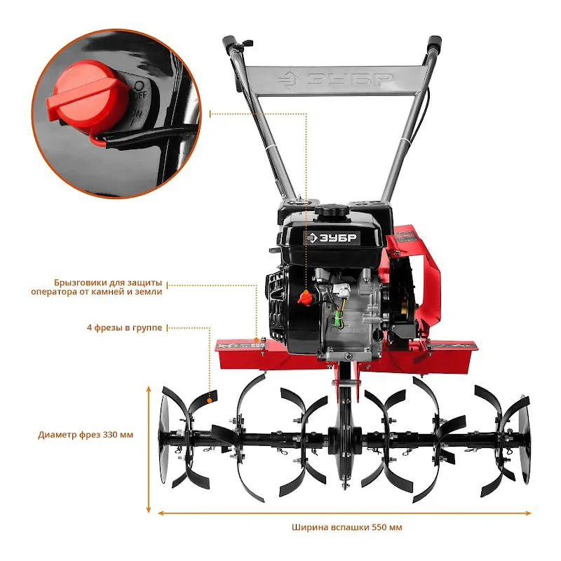 С помощью специальной ручки вы можете самостоятельно контролировать обороты двигателя, учитывая почву и поставленную задачу. Глубина вспашки также настраивается до 330 мм.