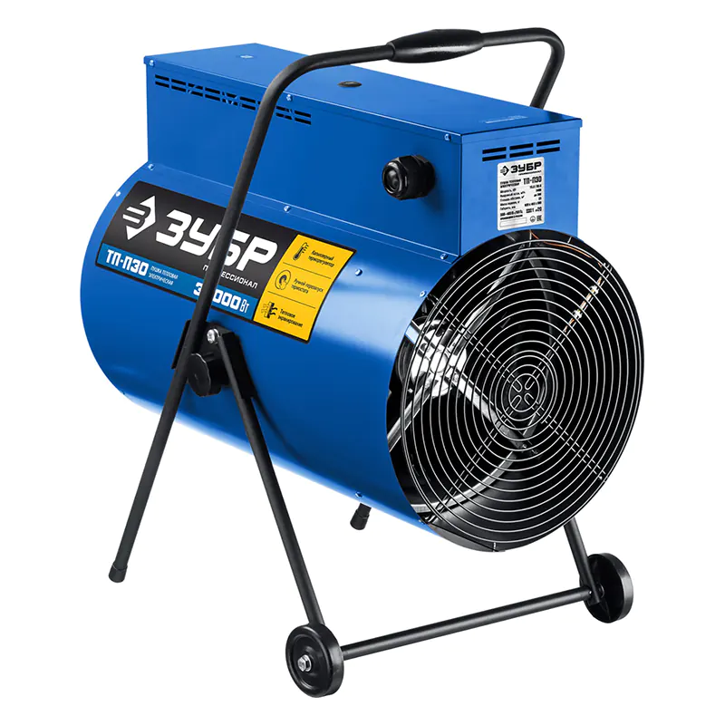 Электрическая тепловая пушка ЗУБР Профессионал 30 кВт ТП-П30 с питанием от трехфазной электрической сети эффективна для быстрого и направленного обогрева складских и производственных помещений, ангаров и мастерских, благодаря большой площади нагревательных элементов и мощным двигателем вентилятора.